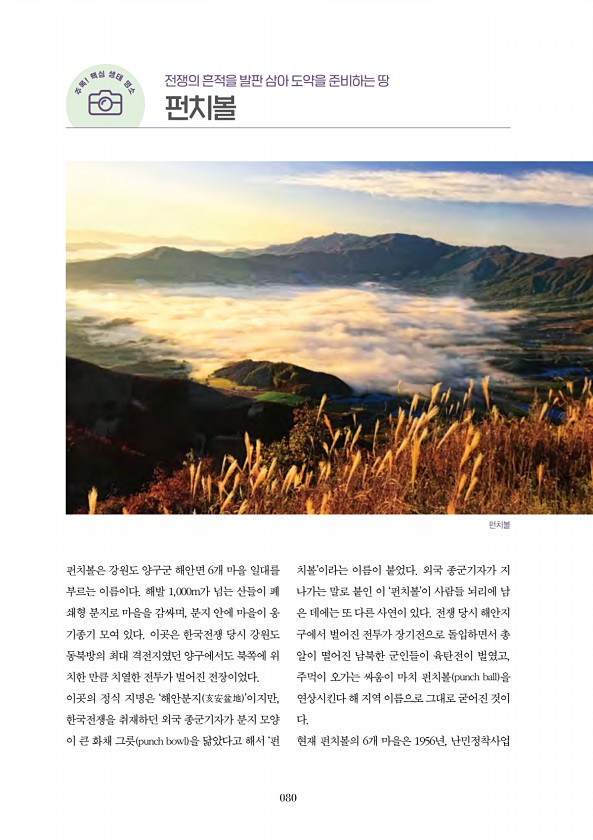 080 펀치볼은 강원도 양구군 해안면 6개 마을 일대를 부르는 이름이다. 해발 1,000m가 넘는 산들이 폐 쇄형 분지로 마을을 감싸며, 분지 안에 마을이 옹 기종기 모여 있다. 이곳은 한국전쟁 당시 강원도 동북방의 최대 격전지였던 양구에서도 북쪽에 위 치한 만큼 치열한 전투가 벌어진 전장이었다. 이곳의 정식 지명은 ‘해안분지 亥安盆地 ’이지만, 한국전쟁을 취재하던 외국 종군기자가 분지 모양 이 큰 화채 그릇 punch bowl 을 닮았다고 해서 ‘펀 치볼’이라는 이름이 붙었다. 외국 종군기자가 지 나가는 말로 붙인 이 ‘펀치볼’이 사람들 뇌리에 남 은 데에는 또 다른 사연이 있다. 전쟁 당시 해안지 구에서 벌어진 전투가 장기전으로 돌입하면서 총 알이 떨어진 남북한 군인들이 육탄전이 벌였고, 주먹이 오가는 ...