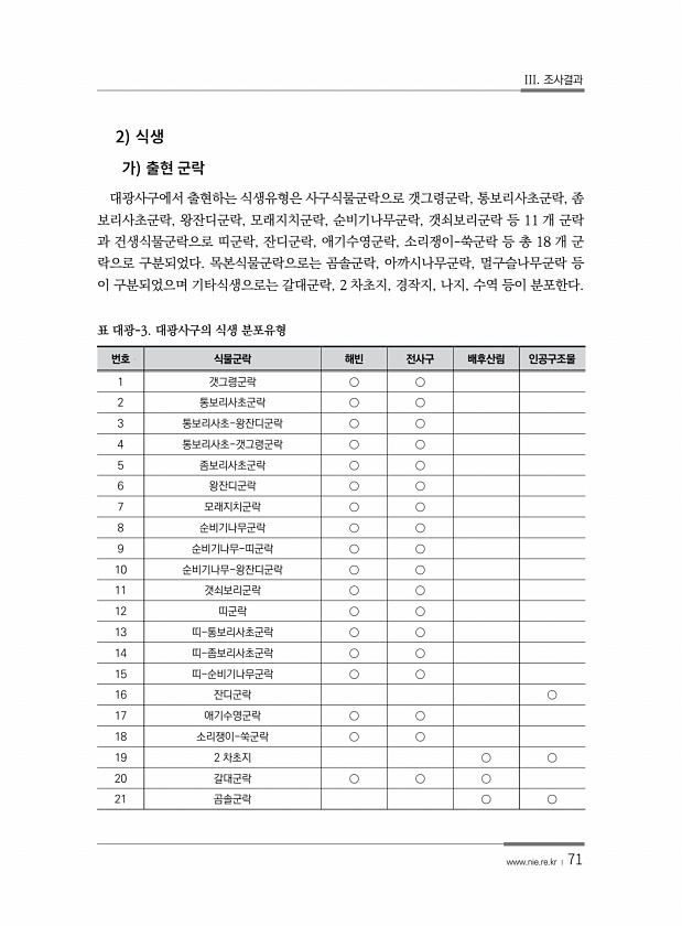 III. 조사결과 www.nie.re.kr ? 71 2 대광사구에서 출현하는 식생유형은 사구식물군락으로 갯그령군락, 통보리사초군락, 좀 보리사초군락, 왕잔디군락, 모래지치군락, 순비기나무군락, 갯쇠보리군락 등 11 개 군락 과 건생식물군락으로 띠군락, 잔디군락, 애기수영군락, 소리쟁이-쑥군락 등 총 18 개 군 락으로 구분되었다. 목본식물군락으로는 곰솔군락, 아까시나무군락, 멀구슬나무군락 등 이 구분되었으며 기타식생으로는 갈대군락, 2 차초지, 경작지, 나지, 수역 등이 분포한다. 번호 식물군락 해빈 전사구 배후산림 인공구조물 1 갯그령군락 ○ ○ 2 통보리사초군락 ○ ○ 3 통보리사초-왕잔디군락 ○ ○ 4 통보리사초-갯그령군락 ○ ○ 5 좀보리사초군락 ○ ○ 6 왕잔디군락 ○ ○ 7 모래지치군락 ○ ○ ...