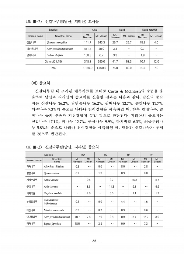 55 Species Alive Dead Dead rate % Korean name Scientfic name Mt. Namsan Mt. Jirisan Namsan Mt. Mt. Jirisan Namsan Mt. Mt. Jirisan 신갈나무 Quercus mongolica 141.7 643.3 26.7 26.7 15.8 4.0 당단풍나무 Acer pseudosieboldianum 451.7 30.0 3.3 0.7 팥배나무 Sorbus alnifolia 168.3 6.7 3.3 1.9 Others 21,15 348.3 390.0 41.7 53.3 10.7 12.0 Total 1,110.0 1,070.0 75.0 80.0 6.3 7.0 표 Ⅲ-2 신갈나무림 남산, 지리산 고사율 바 중요치 신갈나무림 내 조사된 ...