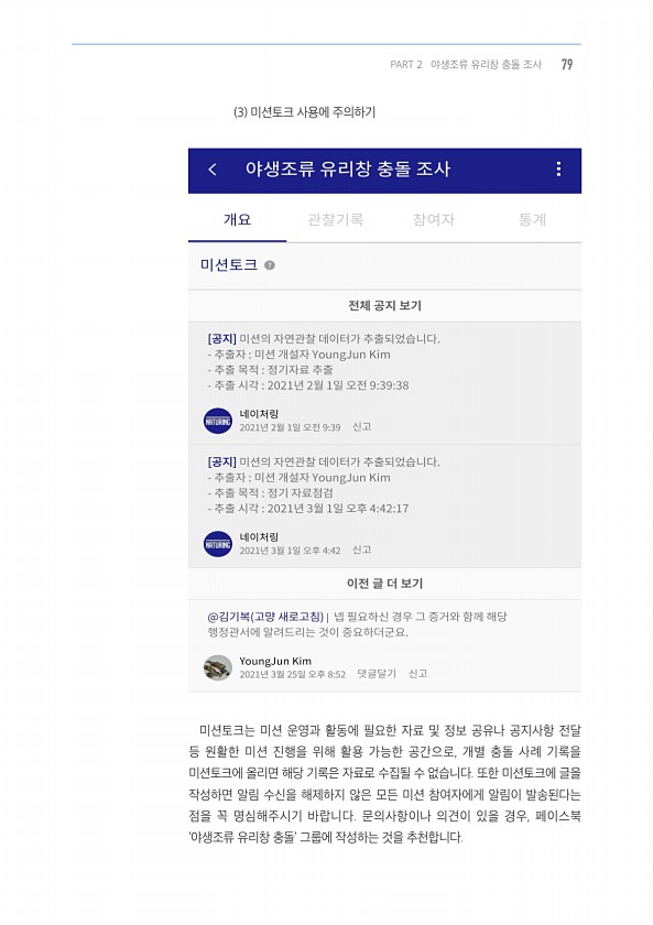 3 미션토크 사용에 주의하기 미션토크는 미션 운영과 활동에 필요한 자료 및 정보 공유나 공지사항 전달 등 원활한 미션 진행을 위해 활용 가능한 공간으로, 개별 충돌 사례 기록을 미션토크에 올리면 해당 기록은 자료로 수집될 수 없습니다. 또한 미션토크에 글을 작성하면 알림 수신을 해제하지 않은 모든 미션 참여자에게 알림이 발송된다는 점을 꼭 명심해주시기 바랍니다. 문의사항이나 의견이 있을 경우, 페이스북 ‘야생조류 유리창 충돌’ 그룹에 작성하는 것을 추천합니다. PART 2 야생조류 유리창 충돌 조사79
