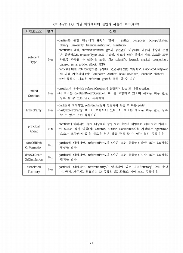 71 커널요소 s 발생 설명 referent Type 0-n -parties를 위한 대상체의 유형의 명세 author, composer, bookpublisher, library, university, financialinstitution, filmstudio -creation에 대해, creationStructuralType과 상관없이 대상체의 내용의 추상적 본질 은 일반적으로 creationType 으로 기술됨. 필요에 따라 형식과 장르 요소를 포함 하도록 확장될 수 있음 예audio file, scientific journal, musical composition, dataset, serial article, eBook, PDF -parties에 대해, referentType은 당사자가 관련되어 있는 ...