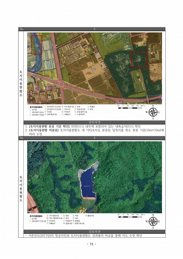 37 포유류 1종 뉴트리아 부 록4의견 1. 토지이용현황 분류 기준 확인 하천 G11 내부에 포함되어 있는 내륙습지 E11 확인 2. 토지이용현황 미분류 토지이용현황도 내 기타초지로 분류된 입목지를 최소 분류 기준 10m×10m 에 따라 수정 No. 3 토지이용현황도 검토의견 기준년도 2017년 의 항공사진과 토지이용현황도 성과품의 비교를 통해 지도 수정확인