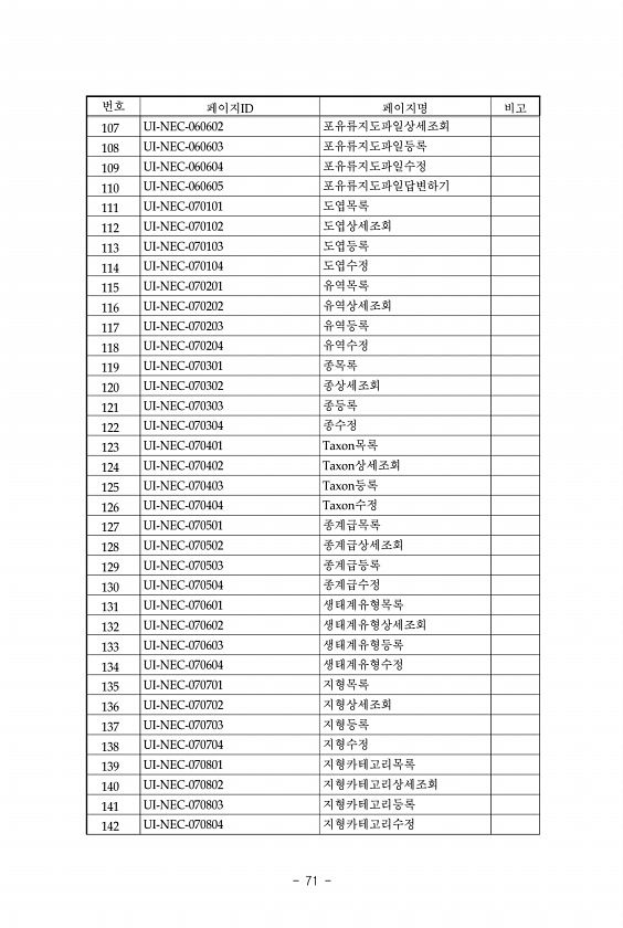 71 번호 페이지ID 페이지명 비고 107 UI-NEC-060602 포유류지도파일상세조회 108 UI-NEC-060603 포유류지도파일등록 109 UI-NEC-060604 포유류지도파일수정 110 UI-NEC-060605 포유류지도파일답변하기 111 UI-NEC-070101 도엽목록 112 UI-NEC-070102 도엽상세조회 113 UI-NEC-070103 도엽등록 114 UI-NEC-070104 도엽수정 115 UI-NEC-070201 유역목록 116 UI-NEC-070202 유역상세조회 117 UI-NEC-070203 유역등록 118 UI-NEC-070204 유역수정 119 UI-NEC-070301 종목록 120 UI-NEC-070302 종상세조회 121 UI-NEC-070303 종등록 122 UI-N...