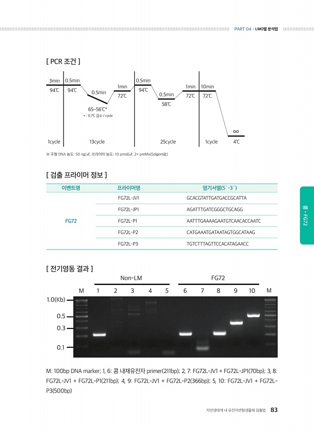 자연생태계 내 유전자변형생물체 검출법 83 PART 04?LMO별 분석법 콩?FG72 [ 검출 프라이머 정보 ] 이벤트명 프라이머명 염기서열 5`-3` FG72 FG72L-JV1 GCACGTATTGATGACCGCATTA FG72L-JP1 AGATTTGATCGGGCTGCAGG FG72L-P1 AATTTGAAAAGAATGTCAACACCAATC FG72L-P2 CATGAAATGATAATAGTGGCATAAG FG72L-P3 TGTCTTTAGTTCCACATAGAACC M100bp DNA marker; 1, 6콩 내재유전자 primer 211bp ; 2, 7FG72L-JV1 + FG72L-JP1 70bp ; 3, 8FG72L-JV1 + FG72L-P1 211bp ; 4, 9FG72L-JV1 + FG72L-P2 366b...