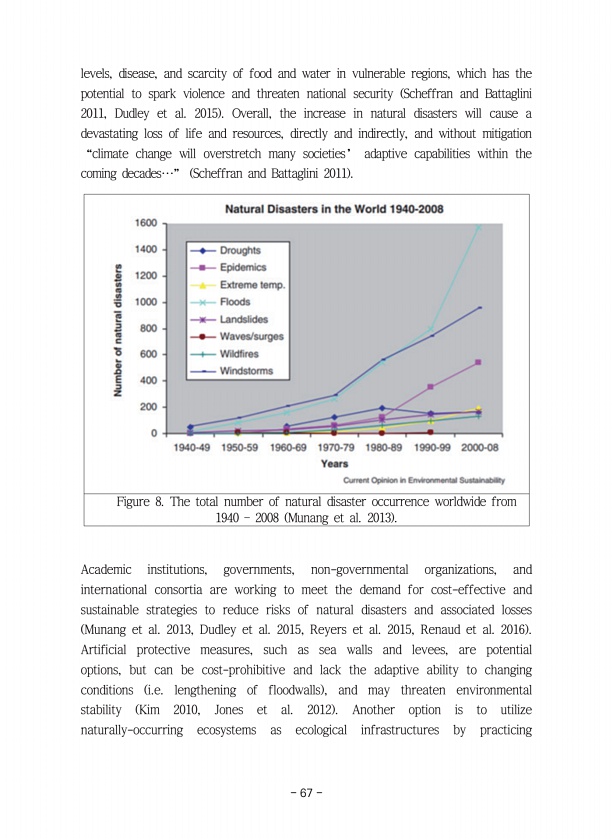 67 levels, disease, and scarcity of food and water in vulnerable regions, which has the potential to spark violence and threaten national security Scheffran and Battaglini 2011, Dudley et al. 2015 Overall, the increase in natural disasters will cause a devastating loss of life and resources, directly and indirectly, and without mitigation “climate change will overstretch many societies’ adaptive c...