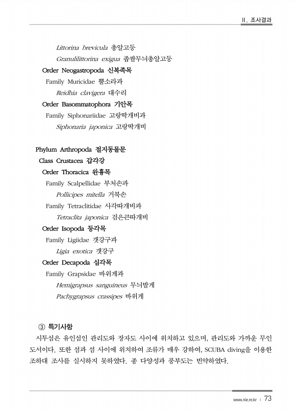 Ⅱ. 조사결과 www.nie.re.kr ? 73 Littorina brevicula 총알고둥 Granulilittorina exigua 좁쌀무늬총알고둥 Order Neogastropoda 신복족목 Family Muricidae 뿔소라과 Reidhia clavigera 대수리 Order Basommatophora 기안목 Family Siphonariidae 고랑딱개비과 Siphonaria japonica 고랑딱개비 Phylum Arthropoda 절지동물문 Class Crustacea 갑각강 Order Thoracica 완흉목 Family Scalpellidae 부처손과 Pollicipes mitella 거북손 Family Tetraclitidae 사각따개비과 Tetraclita japonica 검은큰따개비 ...
