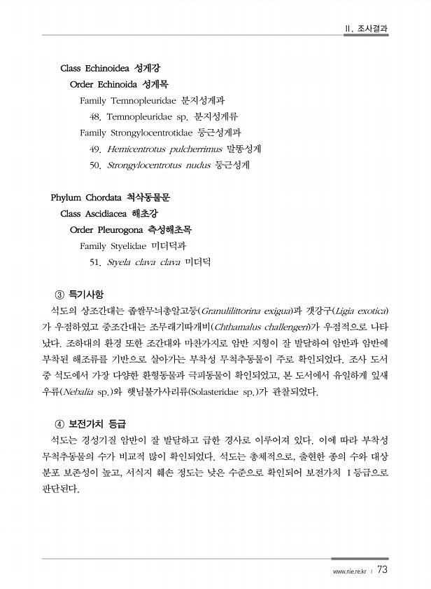 Ⅱ. 조사결과 www.nie.re.kr ? 73 Class Echinoidea 성게강 Order Echinoida 성게목 Family Temnopleuridae 분지성게과 48. Temnopleuridae sp. 분지성게류 Family Strongylocentrotidae 둥근성게과 49. Hemicentrotus pulcherrimus 말똥성게 50. Strongylocentrotus nudus 둥근성게 Phylum Chordata 척삭동물문 Class Ascidiacea 해초강 Order Pleurogona 측성해초목 Family Styelidae 미더덕과 51. Styela clava clava 미더덕 ③ 특기사항 석도의 상조간대는 좁쌀무늬총알고둥 Granulilittorina exigua 과 갯강구 ...