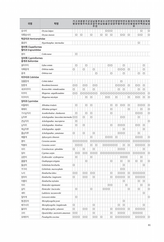 81 송사리 Oryzias latipes ○○○ ○ ○ 대륙송사리 Oryzias sinensis ○ ○ ○ ○ ○ ○ ○○ ○ ○○ ○ 학공치과 Hemiramphidae 줄공치 Hyporhamphus intermedius ○ 청어목 Clupeiformes 멸치과 Engraulididae 웅어 Coilia nasus ○ 잉어목 Cypriniformes 종개과 Balitoridae 쌀미꾸리 Lefua costata ○ ○ ○○ ○ ○ 대륙종개 Orthrias nudus ○ ○ ○ ○○○ ○ ○ 종개 Orthrias toni ○ ○ ○ ○ ○ 미꾸리과 Cobitidae 점줄종개 Cobitis lutheri ○ 참종개 Iksookimia koreensis ○○ ○○ ○○ ○○○○ ○ ○○ ○ 새코미꾸리 Koreoc...