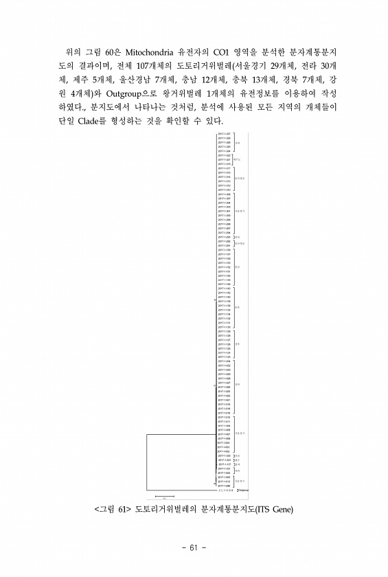61 위의 그림 60은 Mitochondria 유전자의 CO1 영역을 분석한 분자계통분지 도의 결과이며, 전체 107개체의 도토리거위벌레 서울경기 29개체, 전라 30개 체, 제주 5개체, 울산경남 7개체, 충남 12개체, 충북 13개체, 경북 7개체, 강 원 4개체 와 Outgroup으로 왕거위벌레 1개체의 유전정보를 이용하여 작성 하였다., 분지도에서 나타나는 것처럼, 분석에 사용된 모든 지역의 개체들이 단일 Clade를 형성하는 것을 확인할 수 있다. 그림 61 도토리거위벌레의 분자계통분지도 ITS Gene