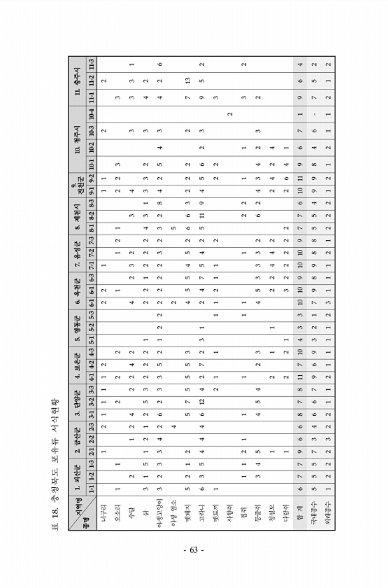 표 18. 충청북도 포유류 서식현황 지역명 종명 1. 괴산군 2. 금산군 3. 단양군 4. 보은군 5. 영동군 6. 옥천군 7. 음성군 8. 제천시 9. 진천군 10. 청주시 11. 충주시 1-1 1-2 1-3 2-1 2-2 2-3 3-1 3-2 3-3 4-1 4-2 4-3 5-1 5-2 5-3 6-1 6-1 6-3 7-1 7-2 7-3 8-1 8-2 8-3 9-1 9-2 10-1 10-2 10-3 10-4 11-1 11-2 11-3 너구리 1 2 1 1 1 1 2 2 2 1 1 1 2 2 오소리 1 1 2 2 2 1 1 2 1 2 2 3 3 수달 2 1 2 4 2 2 4 2 4 2 3 2 3 4 3 3 3 1 삵 3 1 5 1 2 1 2 5 3 2 2 2 1 2 2 1 2 2 2 4 3 1 3 3 2 3 ...