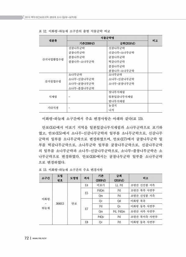 2016 백두대간보호지역 생태계 조사 밀재묘적재 72Ⅰwww.nie.re.kr 표 12. 이화령하늘재 소구간의 출현 식물군락 비교 대분류 식물군락명 비고 기존 2008년 금회 2016년 산지낙엽활엽수림 신갈나무군락 굴참나무군락 졸참나무군락 졸참나무-소나무군락 신갈나무군락 신갈나무-소나무군락 굴참나무군락 떡갈나무군락 졸참나무군락 졸참나무-소나무군락 산지침엽수림 소나무군락 소나무-신갈나무군락 소나무-굴참나무군락 소나무-졸참나무군락 소나무군락 소나무-신갈나무군락 소나무-굴참나무군락 식재림 잣나무식재림 일본잎갈나무식재림 밤나무식재림 기타식생 농경지 나지 이화령하늘재 소구간에서 주요 변경사항은 아래와 같다 표 13 안보 E4 에서 미표기 지역을 일본잎갈나무식재림과 소나무군락으로 표기하 였고, 안보 E5 에서 소나무-...