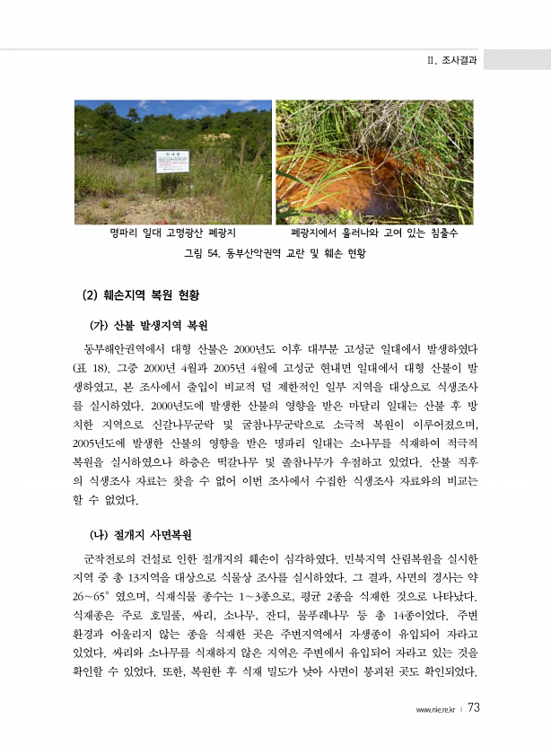 Ⅱ. 조사결과 www.nie.re.kr ? 73 명파리 일대 고명광산 폐광지 폐광지에서 흘러나와 고여 있는 침출수 그림 54. 동부산악권역 교란 및 훼손 현황 2 훼손지역 복원 현황 가 산불 발생지역 복원 동부해안권역에서 대형 산불은 2000년도 이후 대부분 고성군 일대에서 발생하였다 표 18 그중 2000년 4월과 2005년 4월에 고성군 현내면 일대에서 대형 산불이 발 생하였고, 본 조사에서 출입이 비교적 덜 제한적인 일부 지역을 대상으로 식생조사 를 실시하였다. 2000년도에 발생한 산불의 영향을 받은 마달리 일대는 산불 후 방 치한 지역으로 신갈나무군락 및 굴참나무군락으로 소극적 복원이 이루어졌으며, 2005년도에 발생한 산불의 영향을 받은 명파리 일대는 소나무를 식재하여 적극적 복원을 실시하였으나 ...
