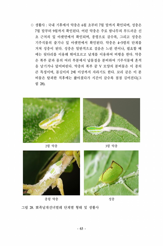 63 ○ 생활사 국내 기후에서 약충은 6월 초부터 7월 말까지 확인되며, 성충은 7월 말부터 9월까지 확인된다. 어린 약충은 주로 밤나무의 부드러운 신 초 근처의 잎 아랫면에서 확인되며, 종령으로 갈수록, 그리고 성충은 기주식물의 줄기나 잎 아랫면에서 확인된다. 약충은 45령의 단계를 거쳐 성충이 된다. 성충은 일반적으로 걸음은 느린 편이나, 필요할 때 에는 뒷다리를 이용해 뛰어오르고 날개를 이용하여 비행을 한다. 약충 은 복부 끝과 몸의 여러 부분에서 납물질을 분비하여 기주식물에 흔적 을 남기거나 덮어버린다. 약충의 복부 끝 V 모양의 분비물은 이 종의 큰 특징이며, 몸길이의 2배 이상까지 자라기도 한다. 꼬리 같은 이 분 비물은 탈피한 직후에는 짧아졌다가 시간이 갈수록 점점 길어진다 그 림 28 2령 약...