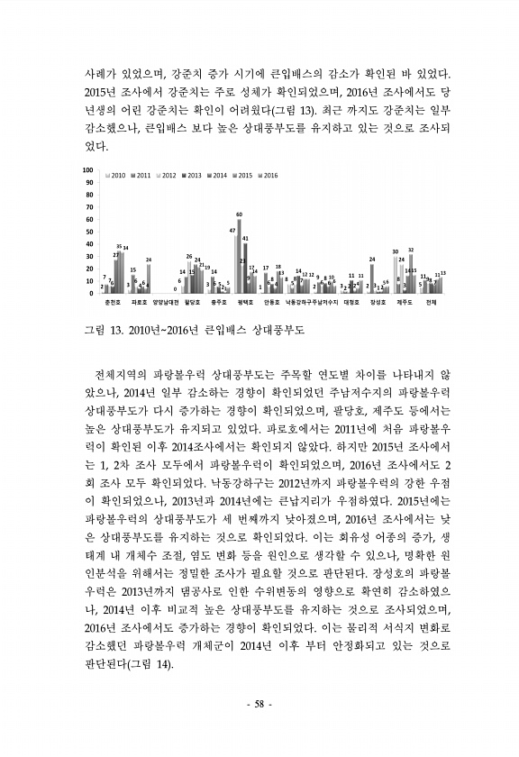 58 사례가 있었으며, 강준치 증가 시기에 큰입배스의 감소가 확인된 바 있었다. 2015년 조사에서 강준치는 주로 성체가 확인되었으며, 2016년 조사에서도 당 년생의 어린 강준치는 확인이 어려웠다 그림 13 최근 까지도 강준치는 일부 감소했으나, 큰입배스 보다 높은 상대풍부도를 유지하고 있는 것으로 조사되 었다. 그림 13. 2010년2016년 큰입배스 상대풍부도 전체지역의 파랑볼우럭 상대풍부도는 주목할 연도별 차이를 나타내지 않 았으나, 2014년 일부 감소하는 경향이 확인되었던 주남저수지의 파랑볼우럭 상대풍부도가 다시 증가하는 경향이 확인되었으며, 팔당호, 제주도 등에서는 높은 상대풍부도가 유지되고 있었다. 파로호에서는 2011년에 처음 파랑볼우 럭이 확인된 이후 2014조사에서는 확인되지 않았다. 하...