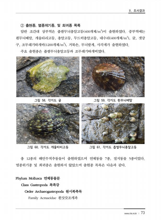 Ⅱ. 조사결과 www.nie.re.kr ? 73 ② 출현종, 멸종위기종, 및 희귀종 목록 암반 조간대 상부역은 좁쌀무늬총알고둥 400개체/m2 이 출현하였다. 중부역에는 흰무늬배말, 개울타리고둥, 총알고둥, 두드럭총알고둥, 대수리 400개체/m2 , 굴, 갯강 구, 조무래기따개비 1200개체/m2 , 거북손, 무늬발게, 사각게가 출현하였다. 주요 출현종은 좁쌀무늬총알고둥과 조무래기따개비였다. 그림 58. 각거도 굴 그림 59. 각거도 흰무늬배말 그림 60. 각거도 개울타리고둥 그림 61. 각거도 좁쌀무늬총알고둥 총 12종의 해안무척추동물이 출현하였으며 연체동물 7종, 절지동물 5종이었다. 멸종위기종 및 희귀종은 출현하지 않았으며 출현종 목록은 다음과 같다. Phylum Mollusca 연체동물문 Class ...