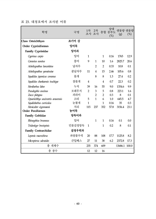 60 학명 국명 1차 조사 2차 조사 총합 상대 풍부도 % 생물량 g 생물량 % Class Osteichthyes 조기어 강 Order Cypriniformes 잉어목 Family Cyprinidae 잉어과 Cyprinus carpio 잉어 1 1 0.16 1765 12.9 Carassius auratus 붕어 9 1 10 1.6 2825.7 20.6 Acheilognathus lanceolatus 납자루 2 2 0.33 10.8 0.1 Acheilognathus yamatsutae 줄납자루 11 4 15 2.46 105.6 0.8 Squalidus japonicus coreanus 몰개 8 8 1.3 27.4 0.2 Squalidus chankaensis tsuchigae 참몰개 4 4 0.7 22.3 0...