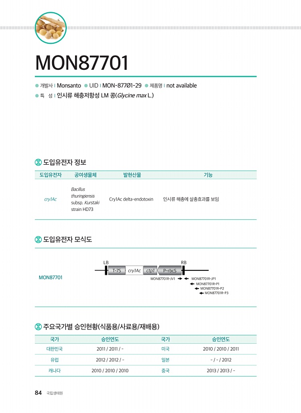 84 국립생태원 ● 개발사ⅠMonsanto ● UIDⅠMON-877Ø1-29 ● 제품명Ⅰnot available ● 특 성Ⅰ인시류 해충저항성 LM 콩 Glycine max L. MON87701 주요국가별 승인현황 식품용/사료용/재배용 국가 승인연도 국가 승인연도 대한민국 2011 2011 미국 2010 2010 2011 유럽 2012 2012 일본 2012 캐나다 2010 2010 2010 중국 2013 2013 도입유전자 정보 도입유전자 공여생물체 발현산물 기능 cry1Ac Bacillus thuringiensis subsp. Kurstaki strain HD73 Cry1Ac delta-endotoxin 인시류 해충에 살충효과를 보임 도입유전자 모식도MON87701