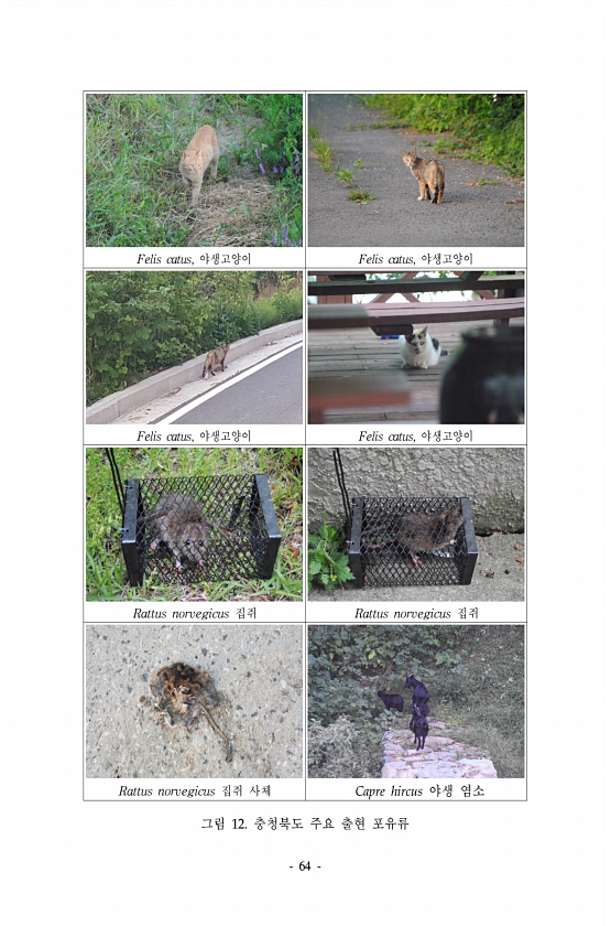 64 Felis catus, 야생고양이 Felis catus, 야생고양이 Felis catus, 야생고양이 Felis catus, 야생고양이 Rattus norvegicus 집쥐 Rattus norvegicus 집쥐 Rattus norvegicus 집쥐 사체 Capre hircus 야생 염소 그림 12. 충청북도 주요 출현포유류