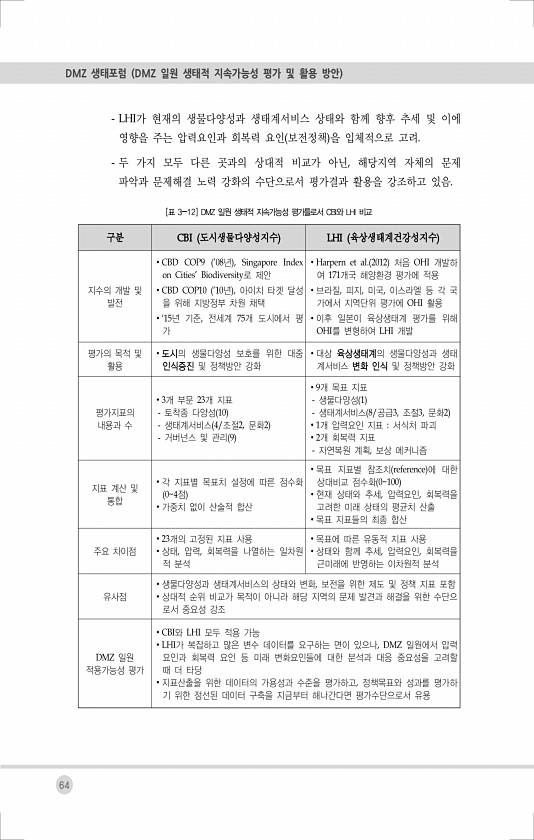 64 DMZ 생태포럼 DMZ 일원 생태적 지속가능성 평가 및 활용 방안 LHI가 현재의 생물다양성과 생태계서비스 상태와 함께 향후 추세 및 이에 영향을 주는 압력요인과 회복력 요인 보전정책 을 입체적으로 고려. 두 가지 모두 다른 곳과의 상대적 비교가 아닌, 해당지역 자체의 문제 파악과 문제해결 노력 강화의 수단으로서 평가결과 활용을 강조하고 있음. 구분 CBI 도시생물다양성지수 LHI 육상생태계건강성지수 지수의 개발 및 발전 ?CBD COP9 08년 , Singapore Index on CitiesBiodiversity로 제안 ?CBD COP10 10년 , 아이치 타겟 달성 을 위해 지방정부 차원 채택 ?‘15년 기준, 전세계 75개 도시에서 평 가 ?Harpern et al. 2012 처음 OHI 개발하...