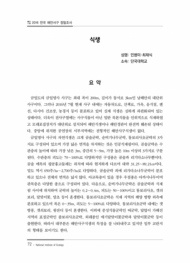 2016 전국 해안사구 정밀조사 72 ? National Institute of Ecology 식생 성명민병미·최재식 소속단국대학교 요 약 금일도의 금일명사 사구는 최대 폭이 200m, 길이가 동서로 3km인 남해안의 대단위 사구이다. 그러나 2016년 7월 현재 사구 내에는 자동차도로, 산책로, 가옥, 음식점, 펜 션, 다시마 건조장, 농경지 등이 분포하고 있어 실제 식생은 심하게 파편화되어 있는 상태이다. 더욱이 전사구열에는 사구식물이 아닌 일반 목본식물을 인위적으로 식재하였 고 모래포집장치가 대단위로 설치되어 해안식생이나 해안경관이 완전히 훼손된 상태이 다. 중앙에 위치한 공연장의 서부지역에는 전형적인 해안사구식생이 없다. 금일명사 사구의 자연식생은 크게 곰솔군락, 순비기나무군락, 통보리사초군락의 3가...