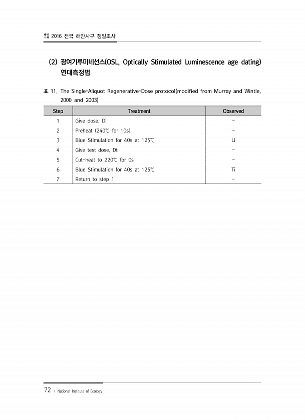 2016 전국 해안사구 정밀조사 72 ? National Institute of Ecology 2 광여기루미네선스 OSL, Optically Stimulated Luminescence age dating 연대측정법 표 11. The Single-Aliquot Regenerative-Dose protocol modified from Murray and Wintle, 2000 and 2003 Step Treatment Observed 1 Give dose, Di 2 Preheat 240℃ for 10s 3 Blue Stimulation for 40s at 125℃ Li 4 Give test dose, Dt 5 Cut-heat to 220℃ for 0s 6 Blue Stimulation for 40s at 125...