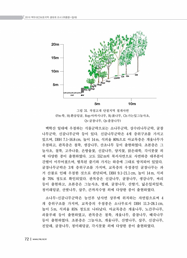 2016 백두대간보호지역 생태계 조사 추풍령밀재 72Ⅰwww.nie.re.kr 그림 31. 작점고개 단절지역 절개사면 Fm쑥, Hj환삼덩굴, Rop아까시나무, Rj붉나무, Ch가는잎그늘사초, Qv굴참나무, Qs졸참나무 백학산 일대에 우점하는 식물군락으로는 소나무군락, 상수리나무군락, 굴참 나무군락, 신갈나무군락 등이 있다. 신갈나무군락은 4개 층위구조를 가지고 있으며, DBH 7.116.8 cm, 높이 14 m, 식피율 80%으로 아교목층은 개옻나무가 우점하고, 관목층은 철쭉, 생강나무, 산초나무 등이 출현하였다. 초본층은 그 늘사초, 철쭉, 고추나물, 은방울꽃, 신갈나무, 양지꽃, 맑은대쑥, 각시붓꽃 외 에 다양한 종이 출현하였다. 고도 552 m의 북서사면으로 사면하층 대부분이 간벌이 이루어졌으며, 벌목...