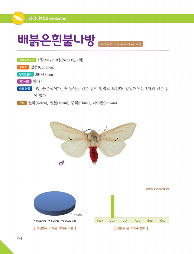 84 태극나방과 Erebidae 성충출현시기 5월 May 9월 Sep 연 2회 풍부도 많음 Common 날개편길이 3848mm 먹이식물 뽕나무 대표 형질 배만 붉은색이다. 배 등에는 검은 점이 일렬로 보인다. 앞날개에는 3개의 검은 점 이 있다. 분포 전국 Korea , 일본 Japan , 중국 China , 타이완 Taiwan 배붉은흰불나방 Spilarctia subcarnea Walker 【 월별로 본 개체수 변화 】 Total1 individual 【 식생별로 조사된 개체수 비율 】 100% 신갈나무림 소나무림 아까시나무림 May Jun Jul Aug SepOct
