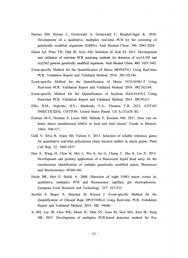 66 Dorries HH, Remus L, Gronewald A, Gronewald C, Berghof-Jager K. 2010. Development of a qualitative, multiplex real-time PCR kit for screening of genetically modified organisms GMOs Anal Bioanal Chem. 3962043-2054. Dinon AZ, Prins TW, Dijk JP, Arisi AM, Scholtens IJ, Kok EJ. 2011. Development and validation of real-time PCR screening methods for detection of cry1A.105 and cry2Ab2 genesin genetic...