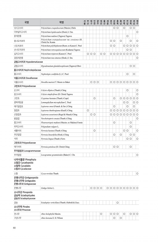 80 낚시고사리 Polystichum craspedosorum Maxim. Diels ○ ○ ○ ○ ○ 더부살이고사리 Polystichum lepidocaulon Hook. J. Sm. ○ 윤개관중 Polystichum makinoi Tagawa Tagawa ○ 참나도히초미 Polystichum ovatopaleaceum var. coraiense H. Christ Sa. Kurata ○ ○ ○ ○ ○ 나도히초미 Polystichum polyblepharum Roem. ex Kunze C. Presl ○ ○ ○ ○ ○ ○ ○ 산나도히초미 Polystichum retrosopaleaceum Kodama Tagawa ○ ○ 십자고사리 Polystichum tripteron Kunze C. Presl ○ ○ ○ ...