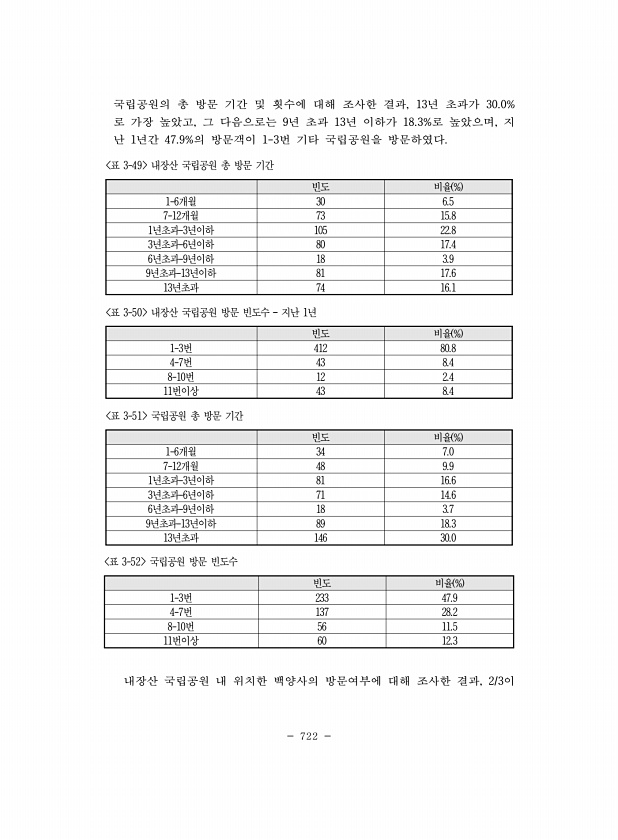 722 국립공원의 총 방문 기간 및 횟수에 대해 조사한 결과, 13년 초과가 30.0% 로 가장 높았고, 그 다음으로는 9년 초과 13년 이하가 18.3%로 높았으며, 지 난 1년간 47.9%의 방문객이 1-3번 기타 국립공원을 방문하였다. 빈도 비율 % 1-6개월 30 6.5 7-12개월 73 15.8 1년초과-3년이하 105 22.8 3년초과-6년이하 80 17.4 6년초과-9년이하 18 3.9 9년초과-13년이하 81 17.6 13년초과 74 16.1 표 3-49 내장산 국립공원 총 방문 기간 빈도 비율 % 1-3번 412 80.8 4-7번 43 8.4 8-10번 12 2.4 11번이상 43 8.4 표 3-50 내장산 국립공원 방문 빈도수 ? 지난 1년 빈도 비율 % 1-6개월 34 7.0 7-12개월...