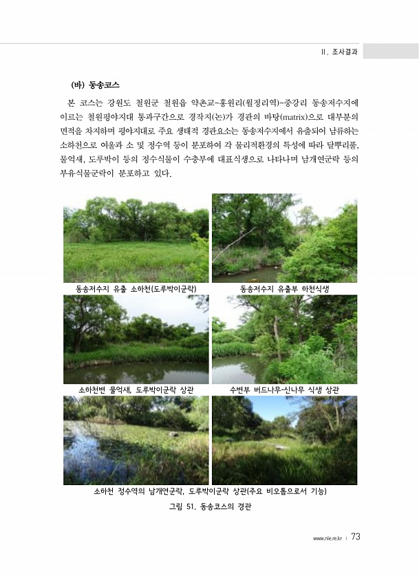 Ⅱ. 조사결과 www.nie.re.kr ? 73 바 동송코스 본 코스는 강원도 철원군 철원읍 약촌교홍원리 월정리역 중강리 동송저수지에 이르는 철원평야지대 통과구간으로 경작지 논 가 경관의 바탕 matrix 으로 대부분의 면적을 차지하며 평야지대로 주요 생태적 경관요소는 동송저수지에서 유출되어 남류하는 소하천으로 여울과 소 및 정수역 등이 분포하여 각 물리적환경의 특성에 따라 달뿌리풀, 물억새, 도루박이 등의 정수식물이 수충부에 대표식생으로 나타나며 남개연군락 등의 부유식물군락이 분포하고 있다. 동송저수지 유출 소하천 도루박이군락 동송저수지 유출부 하천식생 소하천변 물억새, 도루박이군락 상관 수변부 버드나무-신나무 식생 상관 소하천 정수역의 남개연군락, 도루박이군락 상관 주요 비오톱으로서 기능 그림 51. 동...