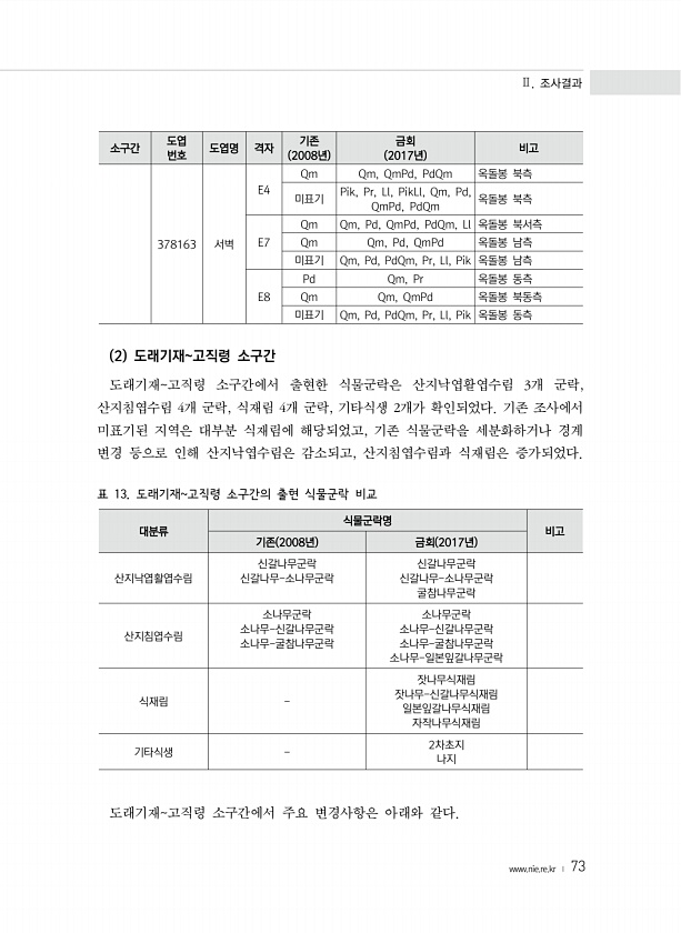 Ⅱ. 조사결과 www.nie.re.kr ? 73 소구간 도엽 번호 도엽명 격자 2008년 기존 2017년 금회 비고 378163 서벽 E4 Qm Qm, QmPd, PdQm 옥돌봉 북측 미표기 Pik, Pr, Ll, PikLl, Qm, Pd, QmPd, PdQm 옥돌봉 북측 E7 Qm Qm, Pd, QmPd, PdQm, Ll 옥돌봉 북서측 Qm Qm, Pd, QmPd 옥돌봉 남측 미표기 Qm, Pd, PdQm, Pr, Ll, Pik 옥돌봉 남측 E8 Pd Qm, Pr 옥돌봉 동측 Qm Qm, QmPd 옥돌봉 북동측 미표기 Qm, Pd, PdQm, Pr, Ll, Pik 옥돌봉 동측 2 도래기재고직령 소구간 도래기재고직령 소구간에서 출현한 식물군락은 산지낙엽활엽수림 3개 군락, 산지침엽수림 4개 군락, 식재림 4...