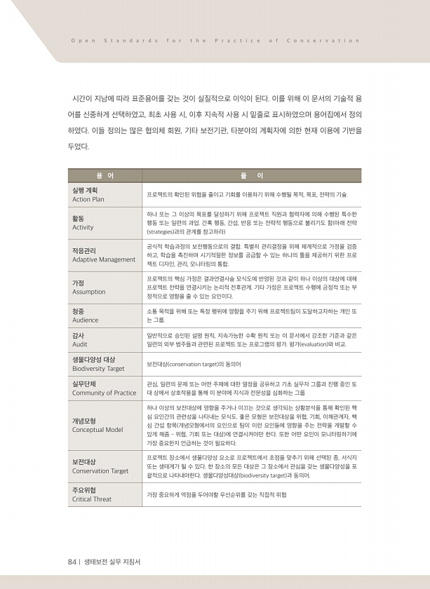 84 | 생태보전 실무 지침서 O p e n S t a n d a r d s f o r t h e P r a c t i c e o f C o n s e r v a t i o n 시간이 지남에 따라 표준용어를 갖는 것이 실질적으로 이익이 된다. 이를 위해 이 문서의 기술적 용 어를 신중하게 선택하였고, 최초 사용 시, 이후 지속적 사용 시 밑줄로 표시하였으며 용어집에서 정의 하였다. 이들 정의는 많은 협의체 회원, 기타 보전기관, 타분야의 계획자에 의한 현재 이용에 기반을 두었다. 용 어 풀 이 실행 계획 Action Plan 프로젝트의 확인된 위협을 줄이고 기회를 이용하기 위해 수행될 목적, 목표, 전략의 기술. 활동 Activity 하나 또는 그 이상의 목표를 달성하기 위해 프로젝트 직원과 협력자에 의해 ...