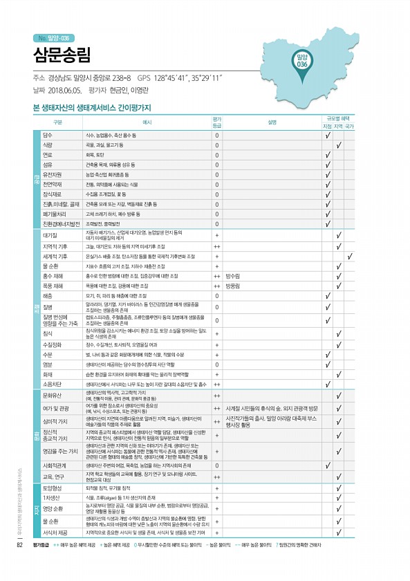 No. 밀양- 본 생태자산의 생태계서비스 간이평가지 구분 예시 평가 등급 설명 규모별 혜택 지점 지역 국가 공급 담수 식수, 농업용수, 축산 용수 등 0 √ 식량 곡물, 과실, 물고기 등 0 √ 연료 화목, 토탄 0 √ 섬유 건축용 목재, 의류용 섬유 등 0 √ 유전자원 농업·축산업 희귀품종 등 0 √ 천연약재 전통, 의약품에 사용되는 식물 0 √ 장식재료 수집용 조개껍질, 꽃 등 0 √ 진흙,미네랄, 골재 건축용 모래 또는 자갈, 벽돌재료 진흙 등 0 √ 폐기물처리 고체 쓰레기 하치, 폐수 방류 등 0 √ 친환경에너지발전 조력발전, 풍력발전 0 √ 조절 대기질 자동차 배기가스, 산업체 대기오염, 농업발생 먼지 등의 대기 미세물질의 제거 + √ 지역적 기후 그늘, 대기온도 저하 등의 지역 미세기후 조절 ++...