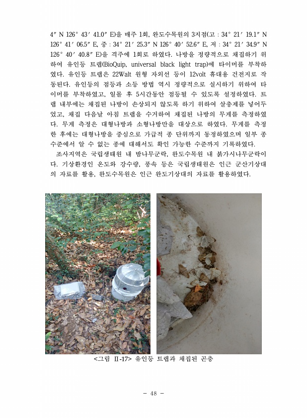 48 4″N 126°43′41.0″E 을 매주 1회, 완도수목원의 3지점 고 34°21′19.1″N 126°41′06.5″E, 중 34°21′25.3″N 126°40′52.6″E, 저 34°21′34.9″N 126°40′40.8″E 을 격주에 1회로 하였다. 나방을 정량적으로 채집하기 위 하여 유인등 트랩 BioQuip, universal black light trap 에 타이머를 부착하 였다. 유인등 트랩은 22Walt 원형 자외선 등이 12volt 휴대용 건전지로 작 동된다. 유인등의 점등과 소등 방법 역시 정량적으로 실시하기 위하여 타 이머를 부착하였고, 일몰 후 5시간동안 점등될 수 있도록 설정하였다. 트 랩 내부에는 채집된 나방이 손상되지 않도록 하기 위하여 살충제를 넣어두 었고, 채집 다음날 아침...