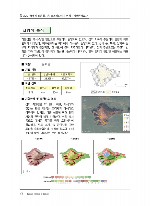 2017 국제적 멸종위기종 뿔제비갈매기 번식·생태환경조사 72 ? National Institute of Ecology 지형적 특징 하벌섬은 북서-남동 방향으로 주절리가 발달되어 있으며, 섬의 서쪽에 주절리와 동향의 헤드 랜드가 나타난다. 헤드랜드에는 해식애와 해식동이 발달되어 있다. 섬의 동, 북서, 남서쪽 일 부에 파식대가 관찰되고, 전 해안에 걸쳐 자갈해안이 나타난다. 섬의 주변으로는 주절리 방 향을 따라 기반암이 침식되어 형성된 시스택이 나타나며, 일부 암맥이 관입한 해안에는 타포 니가 형성되어 있다. ■ 지질응회암 ■ 지표 피복 총 면적 암반노출지 토양피복지 45,735㎡ 28,398㎡ 17,337㎡ ■ 토양 심도 측정지점 최솟값 최댓값 중앙값 48개 4㎝ 20㎝ 11㎝ ■ 지형환경 및 토양심도 분...