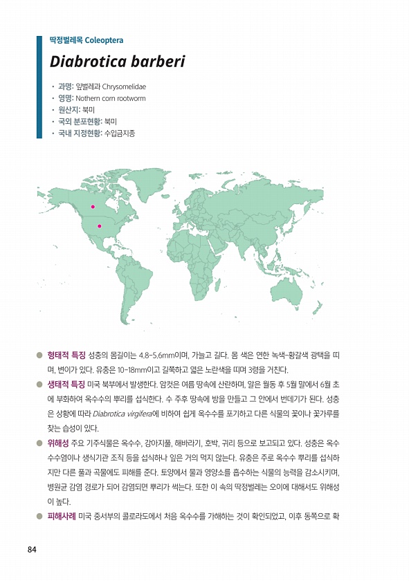 84 ● 형태적 특징 성충의 몸길이는 4.8-5.6mm이며, 가늘고 길다. 몸 색은 연한 녹색-황갈색 광택을 띠 며, 변이가 있다. 유충은 10-18mm이고 길쭉하고 엷은 노란색을 띠며 3령을 거친다. ● 생태적 특징 미국 북부에서 발생한다. 암컷은 여름 땅속에 산란하며, 알은 월동 후 5월 말에서 6월 초 에 부화하여 옥수수의 뿌리를 섭식한다. 수 주후 땅속에 방을 만들고 그 안에서 번데기가 된다. 성충 은 상황에 따라 Diabrotica virgifera에 비하여 쉽게 옥수수를 포기하고 다른 식물의 꽃이나 꽃가루를 찾는 습성이 있다. ● 위해성 주요 기주식물은 옥수수, 강아지풀, 해바라기, 호박, 귀리 등으로 보고되고 있다. 성충은 옥수 수수염이나 생식기관 조직 등을 섭식하나 잎은 거의 먹지 않는다. 유...