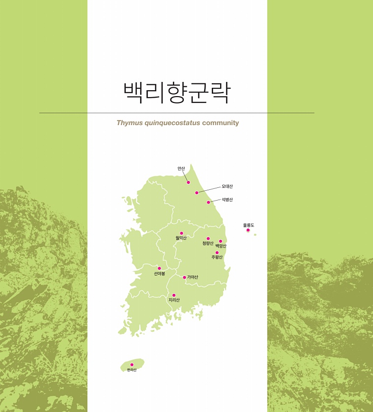백리향군락 Thymus quinquecostatus community 선야봉 지리산 가야산 한라산 오대산 석병산 안산 월악산 울릉도 청량산 백암산 주왕산 ● ● ● ● ● ● ● ● ● ● ●●