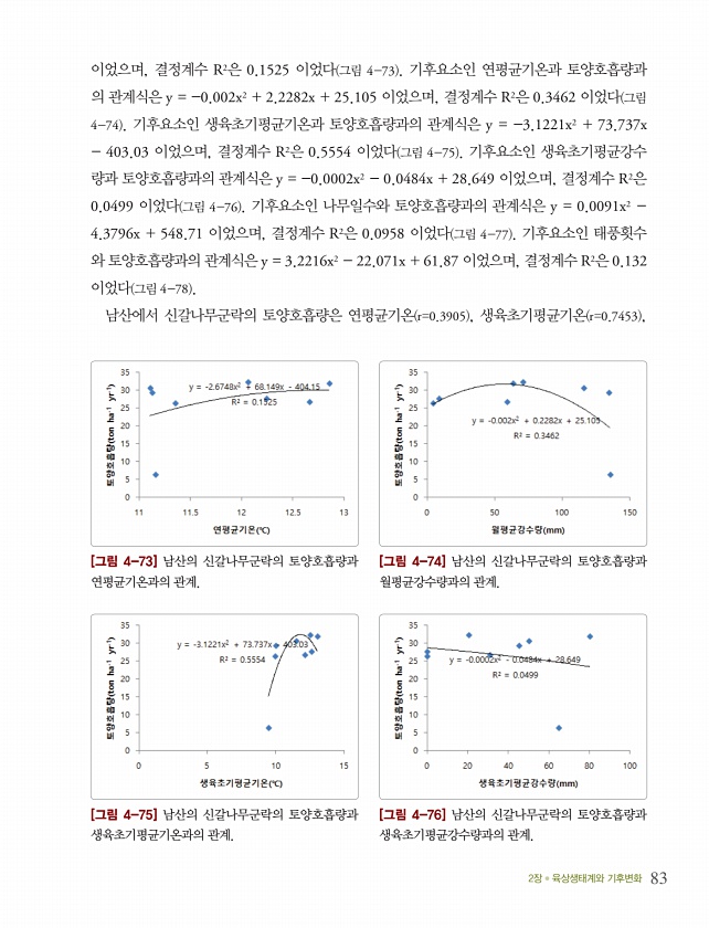 2장 육상생태계와 기후변화 83 이었으며, 결정계수 R2은 0.1525 이었다 그림 4-73 기후요소인 연평균기온과 토양호흡량과 의 관계식은 y = -0.002x2 + 2.2282x + 25.105 이었으며, 결정계수 R2은 0.3462 이었다 그림 4-74 기후요소인 생육초기평균기온과 토양호흡량과의 관계식은 y = -3.1221x2 + 73.737x 403.03 이었으며, 결정계수 R2은 0.5554 이었다 그림 4-75 기후요소인 생육초기평균강수 량과 토양호흡량과의 관계식은 y = -0.0002x2 0.0484x + 28.649 이었으며, 결정계수 R2은 0.0499 이었다 그림 4-76 기후요소인 나무일수와 토양호흡량과의 관계식은 y = 0.0091x2 4.3796x + 548.71 이었으며, 결정계수...