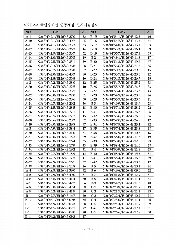 53 NO. GPS 고도 NO. GPS 고도 A-1 N36°0147.1/E126°4337.0 33 B-15 N36°0154.1/E126°4312.3 46 A-10 N36°0143.1/E126°4340.7 65 B-16 N36°0154.7/E126°4313.3 54 A-11 N36°0144.1/E126°4335.3 33 B-17 N36°0154.8/E126°4315.1 63 A-12 N36°0143.1/E126°4336.2 44 B-18 N36°0155.3/E126°4316.4 69 A-13 N36°0141.9/E126°4336.7 52 B-19 N36°0155.7/E126°4317.8 69 A-14 N36°0141.0/E126°4335.5 49 B-2 N36°0149.1/E126°4314.8 17 A-15 ...