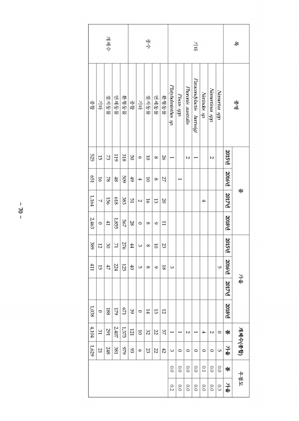 목 종명 봄 가을 개체수 종합 우점도 2015년 2016년 2017년 2018년 2015년 2016년 2017년 2018년 봄 가을 봄 가을 기타 Nemertea spp. 5 0 5 0.0 0.3 Nemertinea spp. 2 2 0 0.0 0.0 Nerindes sp. 4 4 0 0.1 0.0 Paracondylactis hertwigi 1 1 0 0.0 0.0 Phoronis australis 2 2 0 0.0 0.0 Pisces spp. 1 1 0 0.0 0.0 Platyhelminthes sp. 1 3 1 3 0.0 0.2 종수 환형동물 26 27 20 11 23 18 12 57 42 연체동물 8 8 13 9 10 9 13 22 22 절지동물 10 10 16 8 8 8 14 32 23 기타 6 4 ...