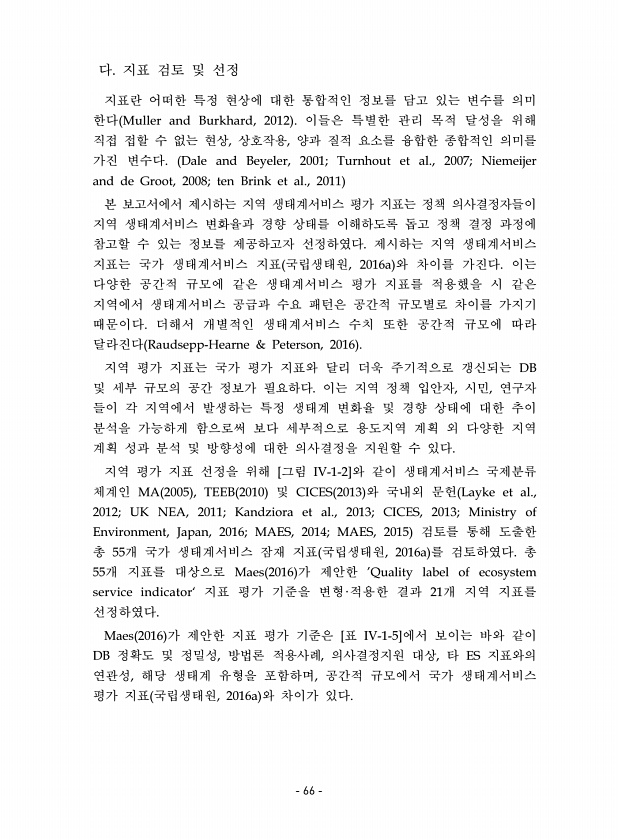 다. 지표 검토 및 선정 지표란 어떠한 특정 현상에 대한 통합적인 정보를 담고 있는 변수를 의미 한다 Muller and Burkhard, 2012 이들은 특별한 관리 목적 달성을 위해 직접 접할 수 없는 현상, 상호작용, 양과 질적 요소를 융합한 종합적인 의미를 가진 변수다. Dale and Beyeler, 2001; Turnhout et al., 2007; Niemeijer and de Groot, 2008; ten Brink et al., 2011 본 보고서에서 제시하는 지역 생태계서비스 평가 지표는 정책 의사결정자들이 지역 생태계서비스 변화율과 경향 상태를 이해하도록 돕고 정책 결정 과정에 참고할 수 있는 정보를 제공하고자 선정하였다. 제시하는 지역 생태계서비스 지표는 국가 생태계서비스 지표 국립생태...