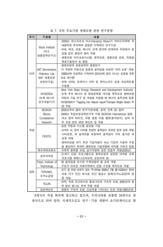 63 표 7. 국외 주요기관 생태모방 관련 연구동향 국가 기관명 내용 미국 Wyss Institute 비스 생물공학연구소 2009년 한스외르크 비스 Hansj?rg Wyss 가 하버드대학에 약 1400억원 투자하여 설립된 다학제간 연구기관 의료, 제조, 로봇, 에너지, 건축 분야와 연계하여 자연에서 영 감을 얻은 물질과 장비 개발 생물모방 마이크로시스템, 분자로봇, 생물모방 로봇, 적응형 재료기술분야 등 중점 MIT Biomimetics Robotics Lab MIT 생물모방 로봇연구실 생태모방과 로봇공학의 융합연구 미 국방부 지원으로 동물의 움직임을 모방한 ‘치타 로봇’ 개발 2009년에 프로젝트 시작하여 2012년에 걸어 다니는 로봇을 유튜 브로 게시함 현재 치타II, 슈퍼미니 치타 및 휴머노이드 로봇 ...