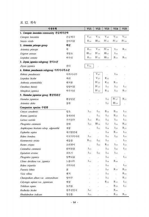 64 식생유형 VU1 VU2 VU3 VU4 VU5 1. Coreopsis lanceolata community 큰금계국군락 Coreopsis lanceolata 큰금계국 V 6-9 V 7-8 V 4-9 V 5-9 V 1-9 Setaria viridis 강아지풀 II 1-4 III 2-5 IV 1-7 IV 2-7 IV 1-8 2. Artemisia princeps group 쑥군 Artemisia princeps 쑥 II 1-3 V 1-5 IV 1-8 I 1-3 R 1-1 Erigeron annuus 개망초 III 1-2 IV 1-5 III 1-7 I 1-6 Lespedeza cuneata 비수리 II 1-3 IV 1-4 III 1-5 II 1-5 R 5-5 3. Zoysia japonica subgroup ...