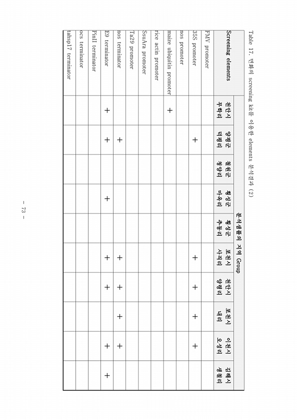 73 Screening elements 분석샘플의 지역 Group 천안시 무학리 양평군 덕평리 철원군 청양리 횡성군 마옥리 횡성군 추동리 포천시 사직리 천안시 양령리 포천시 내리 이천시 오성리 김해시 생철리 FMV promoter 35S promoter + + + + + nos promoter maize ubiquitin promoter + rice actin promoter SsuAra promoter Ta29 promoter nos terminator + + + + + E9 terminator + + + + + + + PinII terminator ocs terminator tahsp17 terminator Table 17. 면화의 screening kit를 이용한 elements 분석결과 2