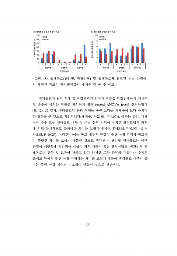 68 그림 48 생태통로 관리형, 비관리형 및 생태통로와 연결된 주변 산림에 서 채집된 지표성 딱정벌레류의 개체수 및 종 수 비교 생태통로의 관리 형태 및 함정트랩의 위치가 지표성 딱정벌레류의 개체수 및 종수에 미치는 영향을 확인하기 위해 nested ANOVA test를 실시하였다 표 12 그 결과, 생태통로의 관리 형태는 종수 보다는 개체수에 보다 유의미 한 영향을 준 것으로 확인되었다 개체수, F=20.06, P 0.001 이와는 달리, 개체 수와 종수 모두 생태통로 내부 및 주변 산림 지역에 설치한 함정트랩의 위치 에 의해 통계적으로 유의미한 차이를 보였다 개체수, F=18.68, P 0.001; 종수, F=2.45, P=0.027 이러한 차이는 통로 내부의 환경이 주변 산림 지역과 비교하 여 뚜렷한...
