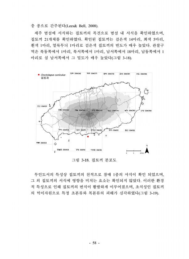58 충 종으로 간주된다 Lees& Bell, 2008 제주 범섬에 서식하는 집토끼의 목견으로 범섬 내 서식을 확인하였으며, 집토끼 21개체를 확인하였다. 확인된 집토끼는 검은색 14마리, 회색 5마리, 흰색 1마리, 얼룩무늬 1마리로 검은색 집토끼의 빈도가 매우 높았다. 관찰구 역은 북동쪽에서 1마리, 북서쪽에서 1마리, 남서쪽에서 18마리, 남동쪽에서 1 마리로 섬 남서쪽에서 그 밀도가 매우 높았다 그림 3-18 그림 3-18. 집토끼 분포도 무인도서의 특성상 집토끼의 천적으로 참매 1종의 서식이 확인 되었으며, 그 외 집토끼의 서식에 영향을 미치는 요소는 확인되지 않았다. 이러한 환경 적 특성으로 인해 집토끼의 번식이 활발하게 이루어졌으며, 초식성인 집토끼 의 먹이자원으로 특정 초본류와 목본류의 피해가...