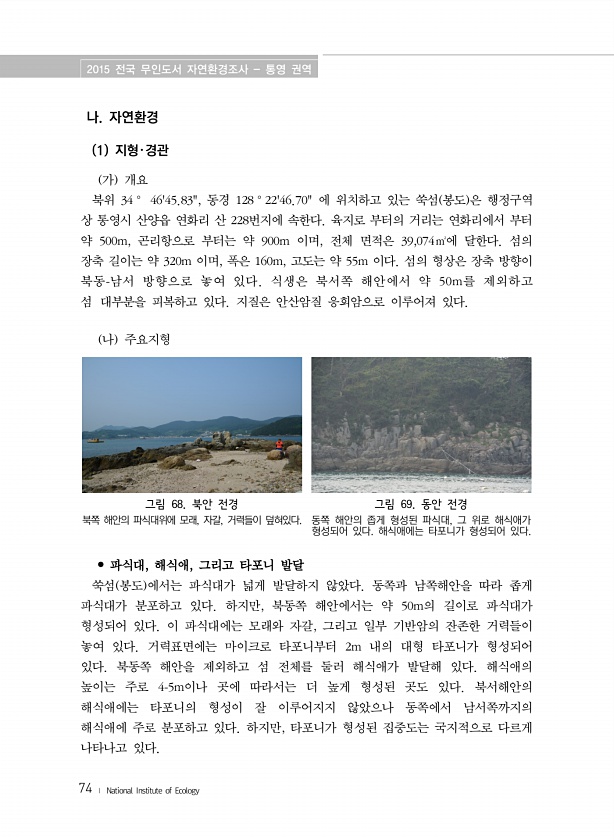 2015 전국 무인도서 자연환경조사 통영 권역 74 ? National Institute of Ecology 나. 자연환경 1 지형?경관 가 개요 북위 34˚ 4645.83, 동경 128˚2246.70에 위치하고 있는 쑥섬 봉도 은 행정구역 상 통영시 산양읍 연화리 산 228번지에 속한다. 육지로 부터의 거리는 연화리에서 부터 약 500m, 곤리항으로 부터는 약 900m 이며, 전체 면적은 39,074㎡에 달한다. 섬의 장축 길이는 약 320m 이며, 폭은 160m, 고도는 약 55m 이다. 섬의 형상은 장축 방향이 북동-남서 방향으로 놓여 있다. 식생은 북서쪽 해안에서 약 50m를 제외하고 섬 대부분을 피복하고 있다. 지질은 안산암질 응회암으로 이루어져 있다. 나 주요지형 그림 68. 북안 전경 북쪽 해안...
