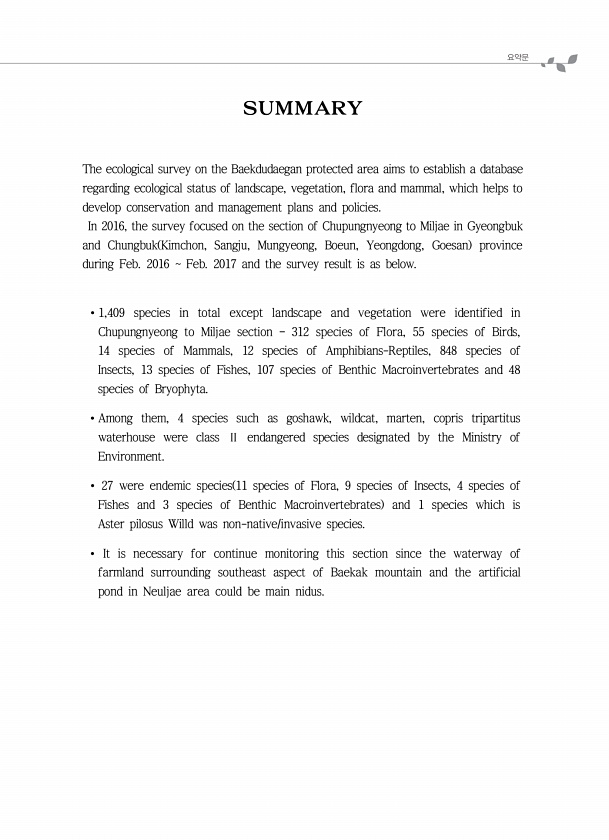 요약문 SUMMARY The ecological survey on the Baekdudaegan protected area aims to establish a database regarding ecological status of landscape, vegetation, flora and mammal, which helps to develop conservation and management plans and policies. In 2016, the survey focused on the section of Chupungnyeong to Miljae in Gyeongbuk and Chungbuk Kimchon, Sangju, Mungyeong, Boeun, Yeongdong, Goesan province d...