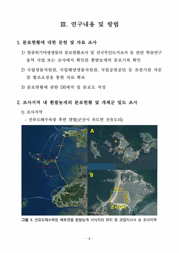 6 Ⅲ. 연구내용 및 방법 1. 분포현황에 대한 문헌 및 자료 조사 1 멸종위기야생생물의 분포현황조사 및 전국무인도서조사 등 관련 학술연구 용역 사업 또는 조사에서 확인된 흰발농게의 분포기록 확인 2 국립생물자원관, 국립해양생물자원관, 국립공원공단 등 유관기관 자문 및 협조요청을 통한 자료 확보 3 분포현황에 관한 DB제작 및 분포도 작성 2. 조사지역 내 흰발농게의 분포현황 및 개체군 밀도 조사 1 조사지역 선유도해수욕장 후면 갯벌 군산시 옥도면 선유도리 그림 1. 선유도해수욕장 배후갯벌 흰발농게 서식지의 위치 및 과업지시서 상조사지역